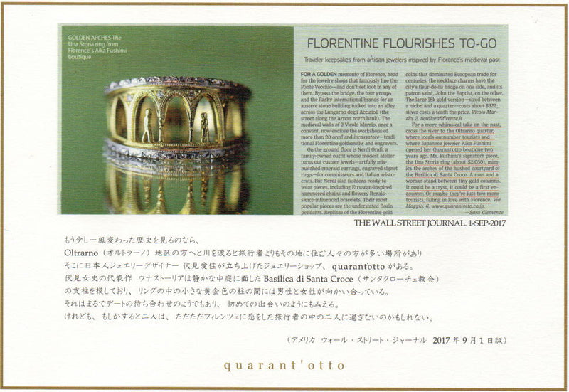 For a more whimsical take on the past, cross the river to the Oltrarno quarter, where locals outnumber tourists and where Japanese jeweler Aika Fushimi opened her Quarant’otto boutique two years ago. Ms. Fushimi’s signature piece, the Una Storia ring (about $2,050), mimics the arches of the hushed courtyard of the Basilica di Santa Croce. A man and a woman stand between tiny gold columns. It could be a tryst, it could be a first encounter. Or maybe they’re just two more tourists, falling in love with Florence. Via Maggio, 6,